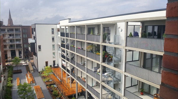 (Blick in den Innenhof mit der Terasse, die zum Wohnprojekt gehört.)